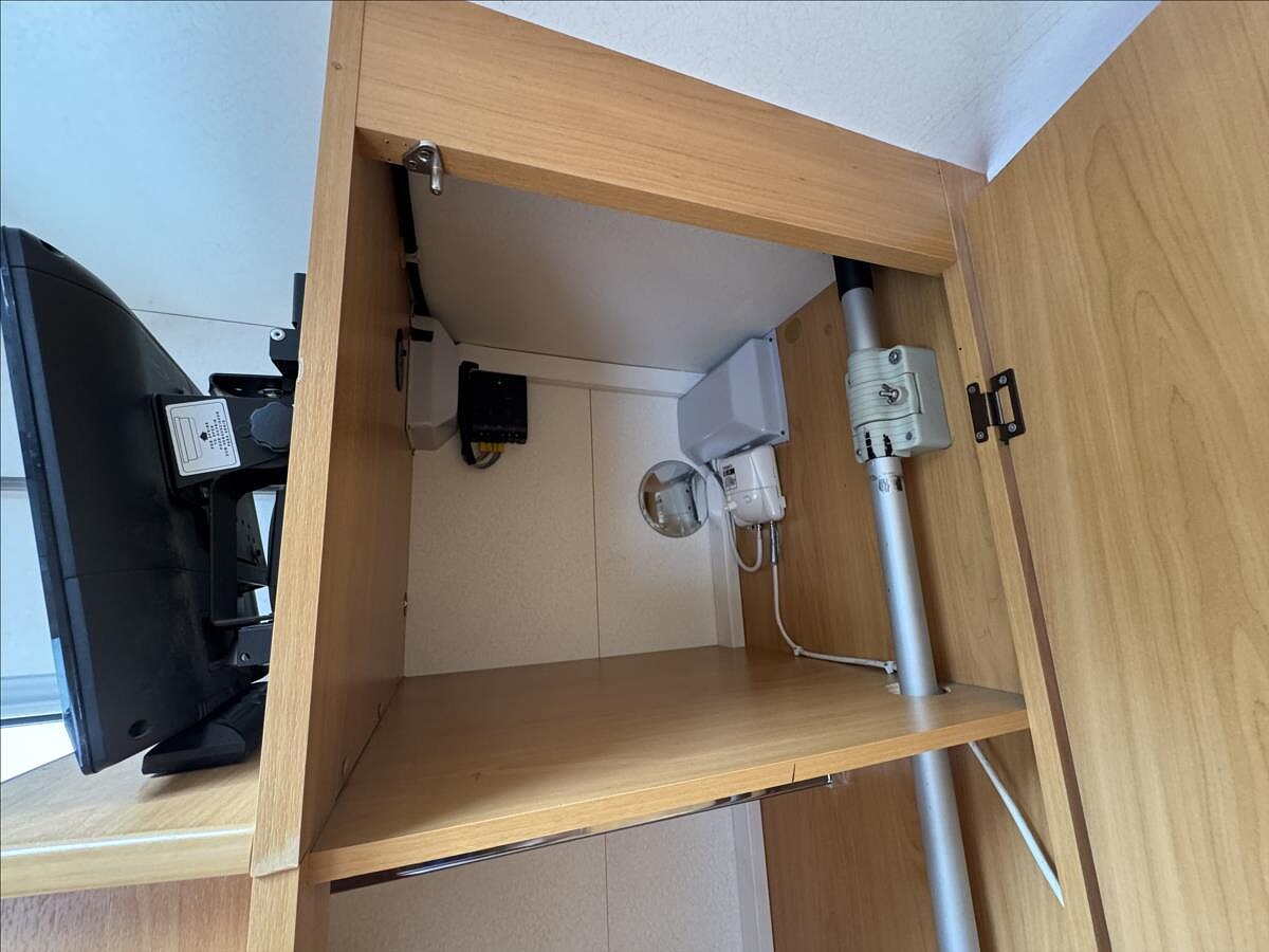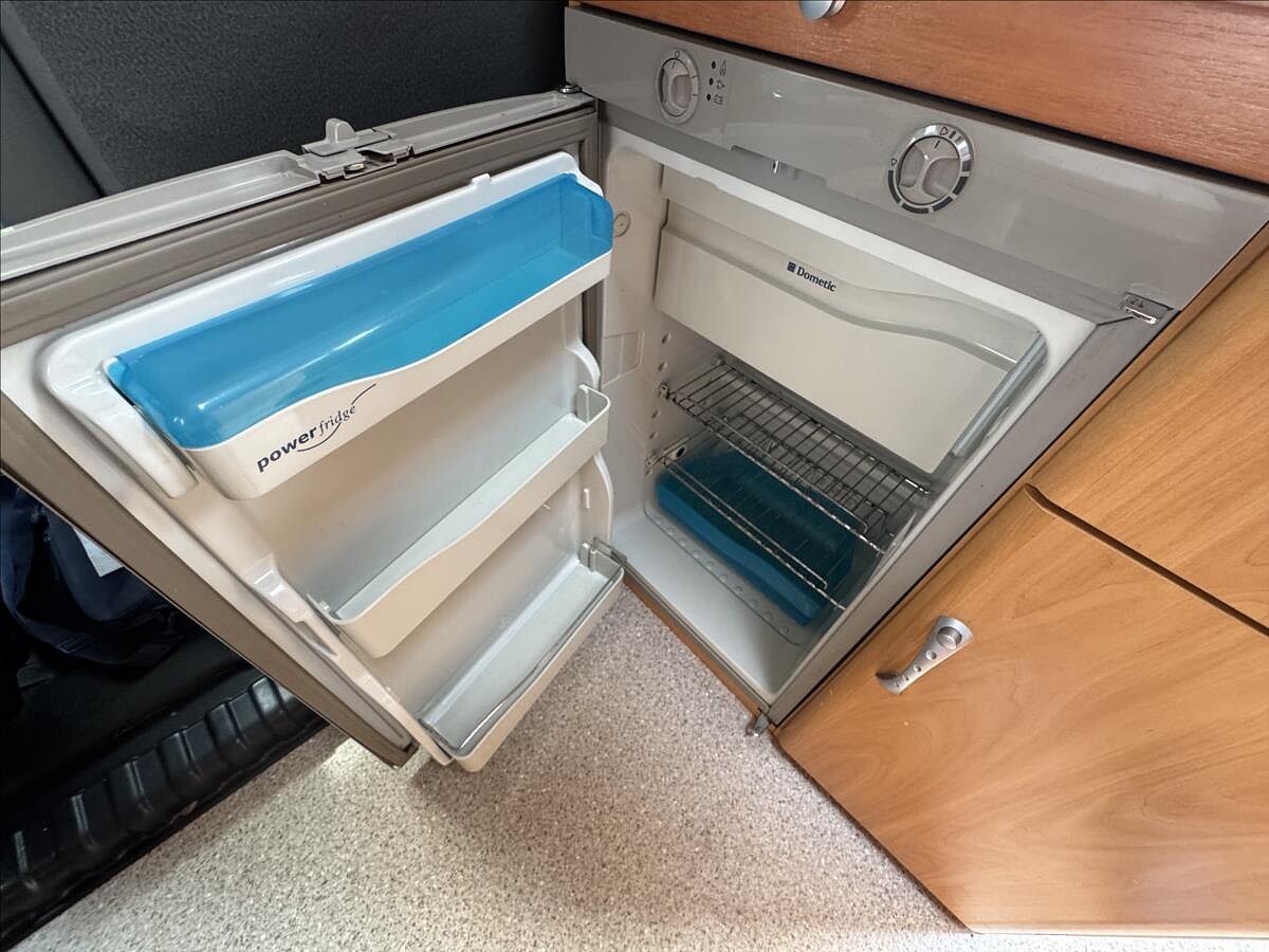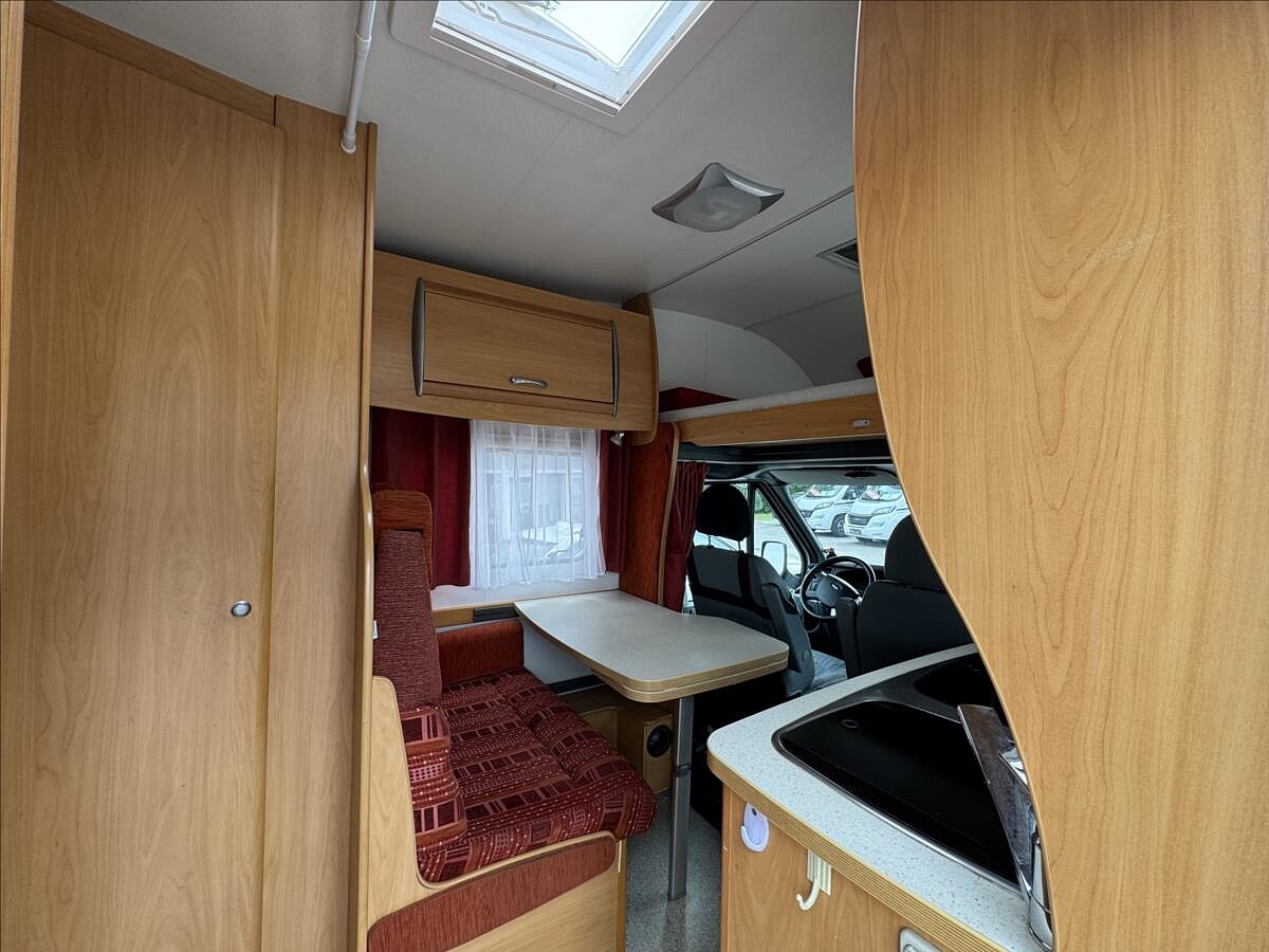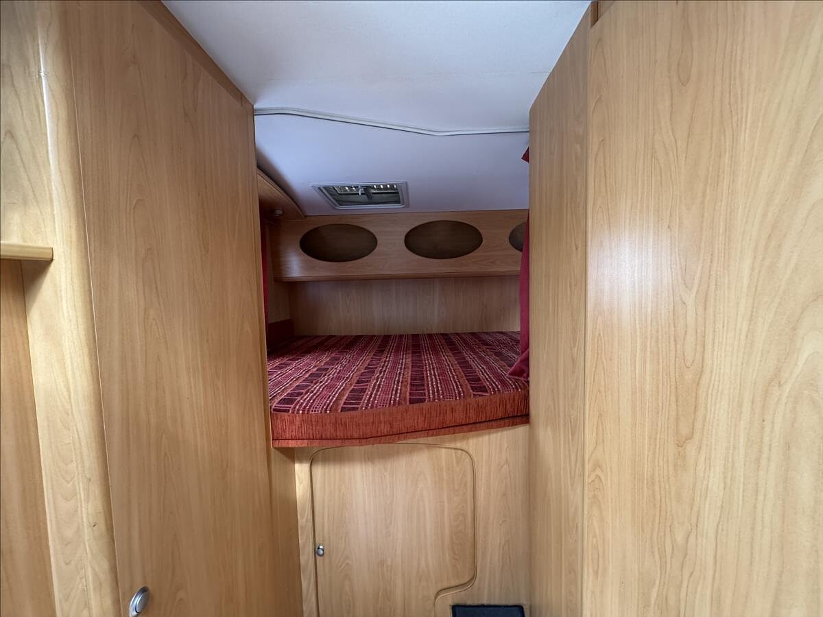 Zadní příčná postel + spaní v alkovně, koupelna s WC + umyvadlem a sprchou, naftové topení, TV na 12V, solární panel, nosič 2 kol ..... Celková hmotnost: 3500kg, provozní: 2833kg... Celková délka: 590cm, výška: 293cm a šířka: 230cm