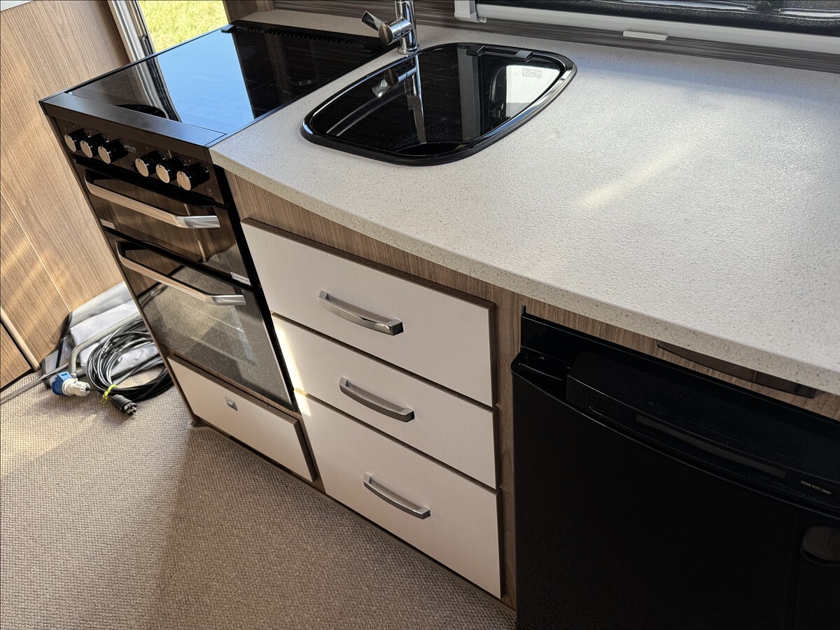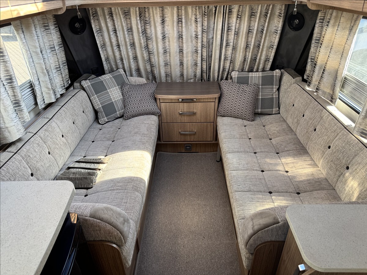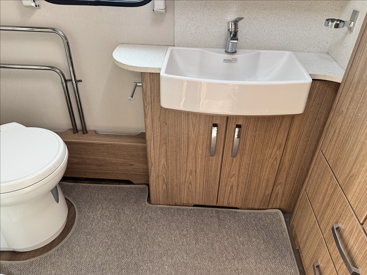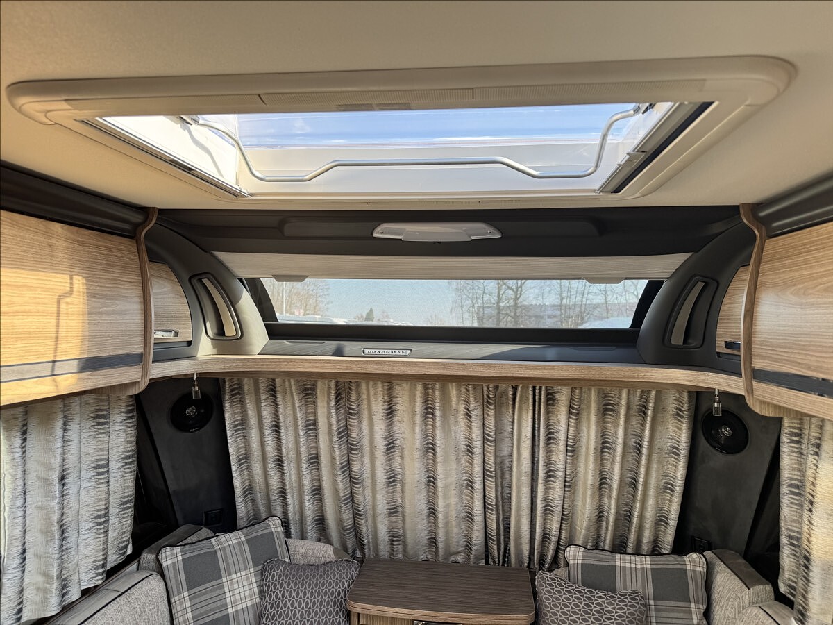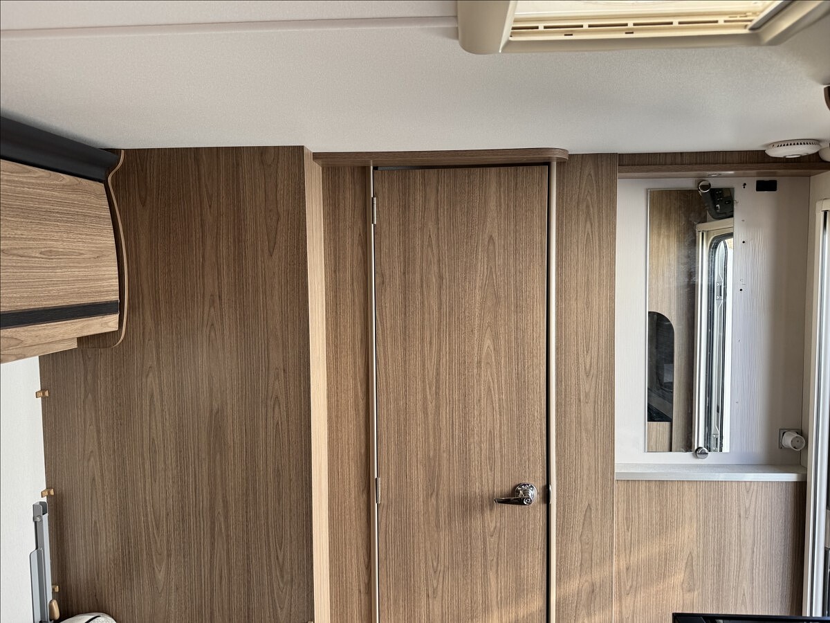 Přední podélné postele s úpravou na jednolůžko, lednice s mrazákem 12/230V/plyn, velká koupelna s odděleným WC a umyvadlem, teplovodní topení ALDE, 2x solární panel 150W + 2x nástavbová baterie, mover, LED kompletní osvětlení, velký sporák s grilem a troubou, nádrž na čistou vodu 90l, markýza, stropní ventilátor