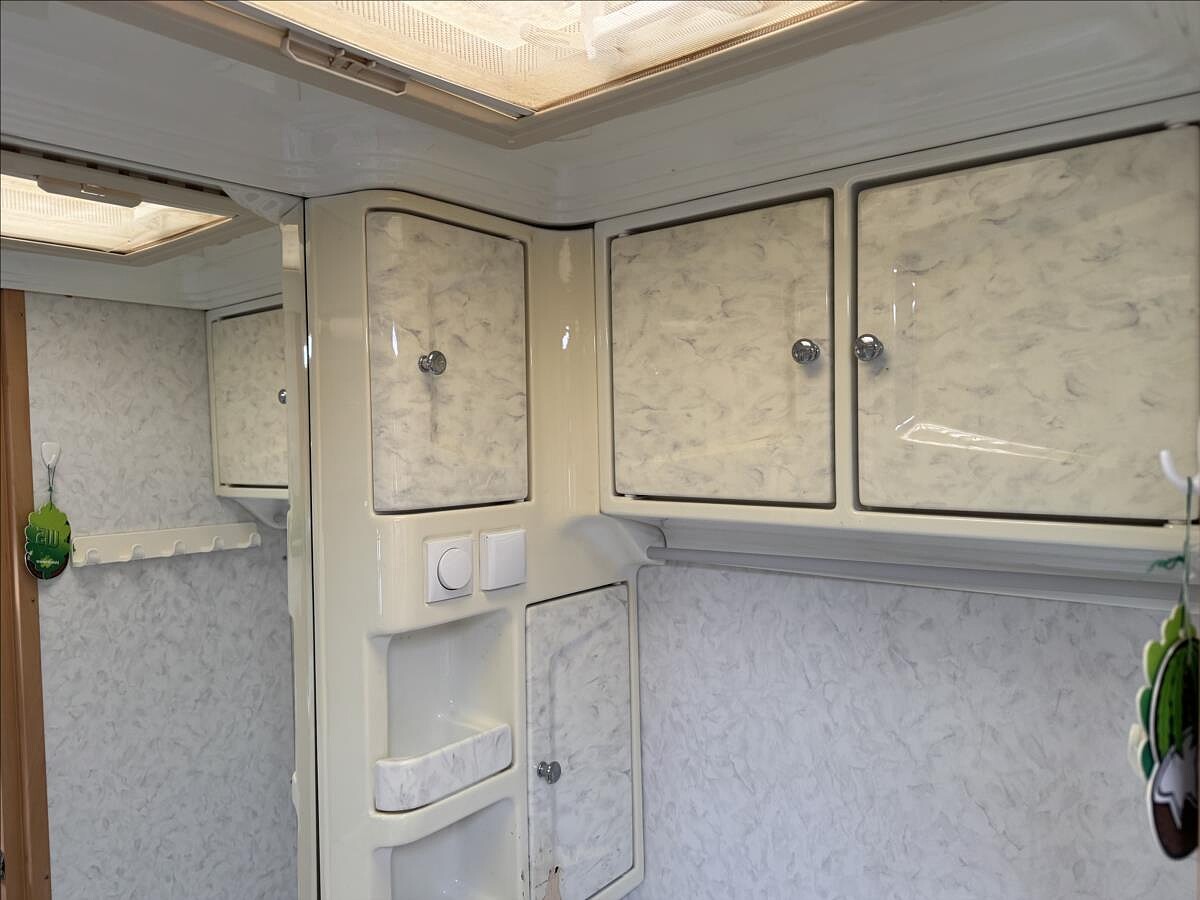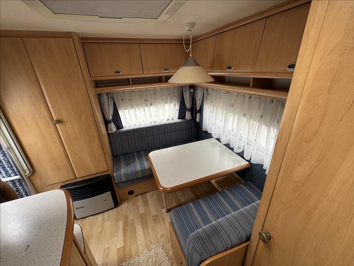 Zadní příčná postel + sezení rozložitelné na lůžko, koupelna s WC, lednice 12/230V/plyn, plynové topení Truma, nádrž na čistou vodu, solární panel + přídavná baterie, všechna okna se zatemněním a moskytiérou, nájezdová brzda se stabilizátorem .... Celková hmotnost: 1200kg, provozní: 1055kg ... Celková délka: 638cm, výška: 254cm a šířka: 230cm