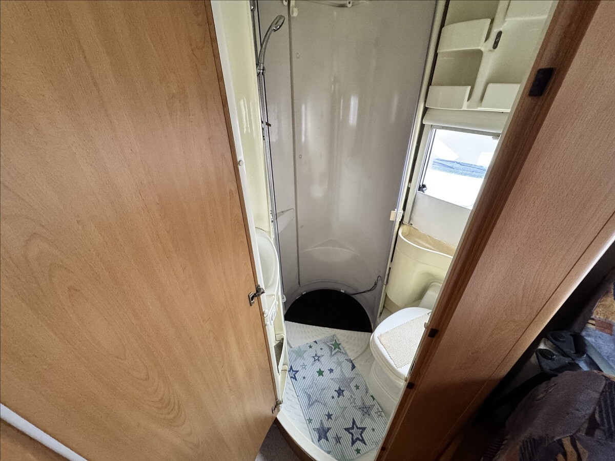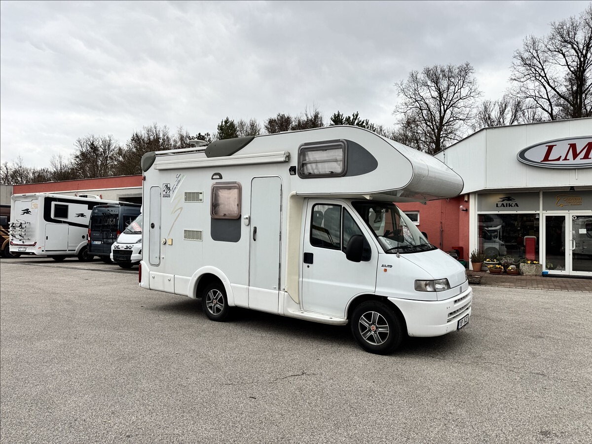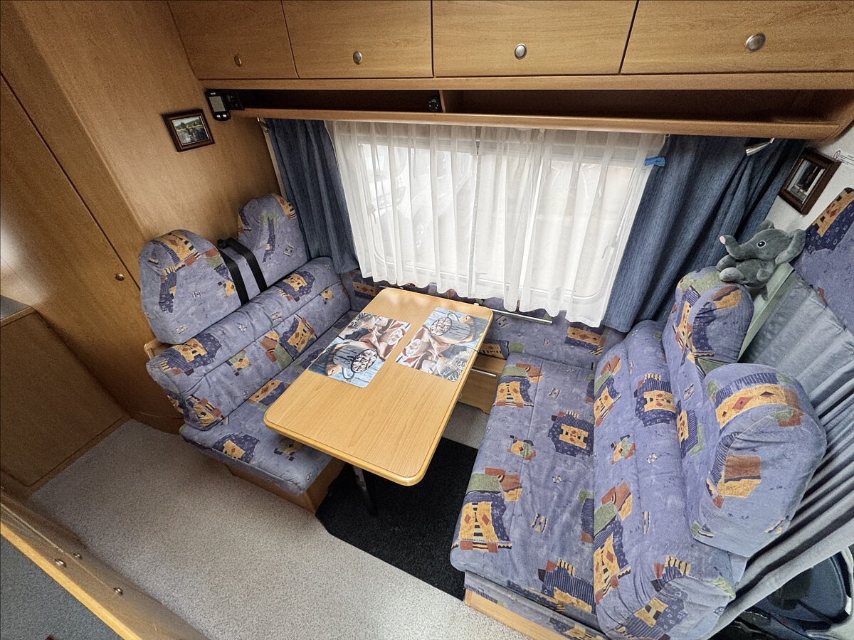 Velké spaní v alkovně + rozkládací sezení s úpravou na lůžko, lednice s mrazákem 12/230V/plyn, velká koupelna, všechna okna se zatemněním amoskytiérou, topení TRUMA Combi, nosič kol, střešní nosič, žebřík ... Celková hmotnost: 3400kg, provozní:2870kg ... Celková délka:594cm, šířka: 224cm, výška: 303cm